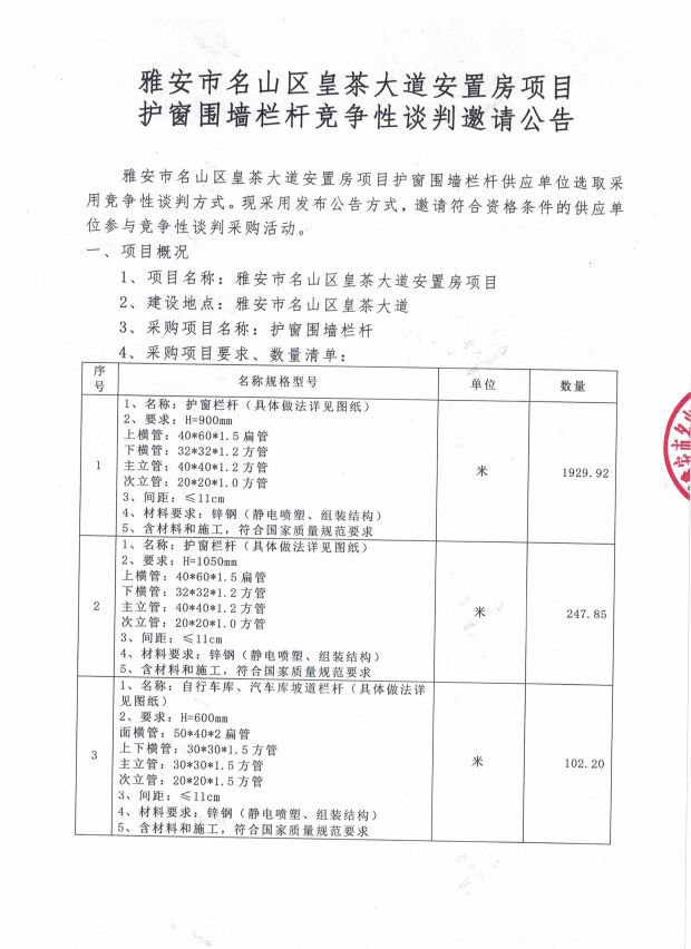 雅安市名山區(qū)皇茶大道安置房項(xiàng)目 護(hù)窗圍墻欄桿競(jìng)爭(zhēng)性談判邀請(qǐng)公告